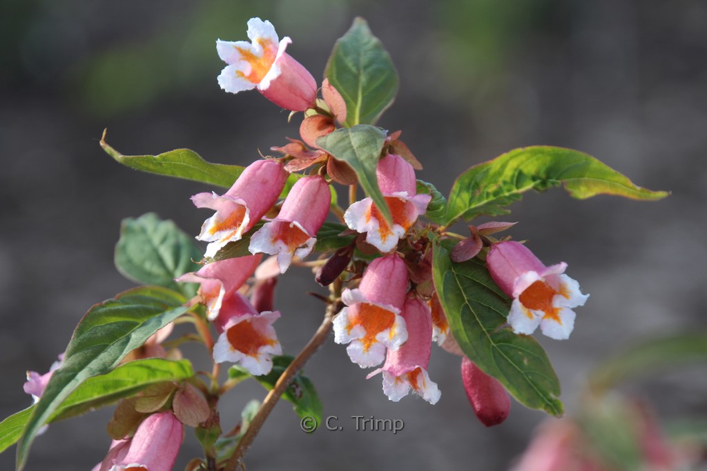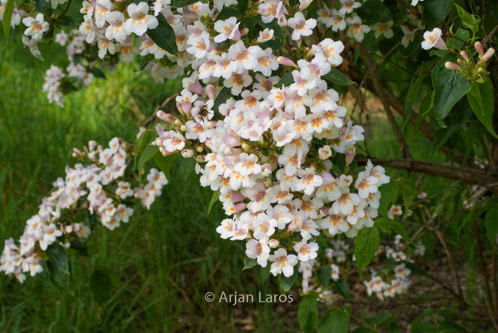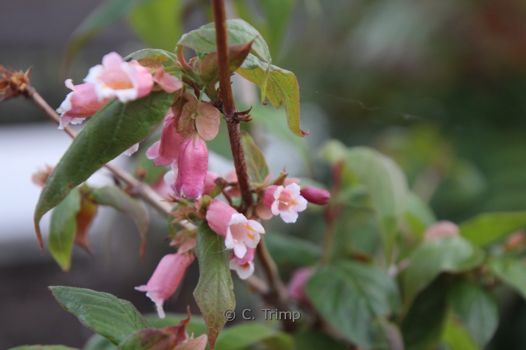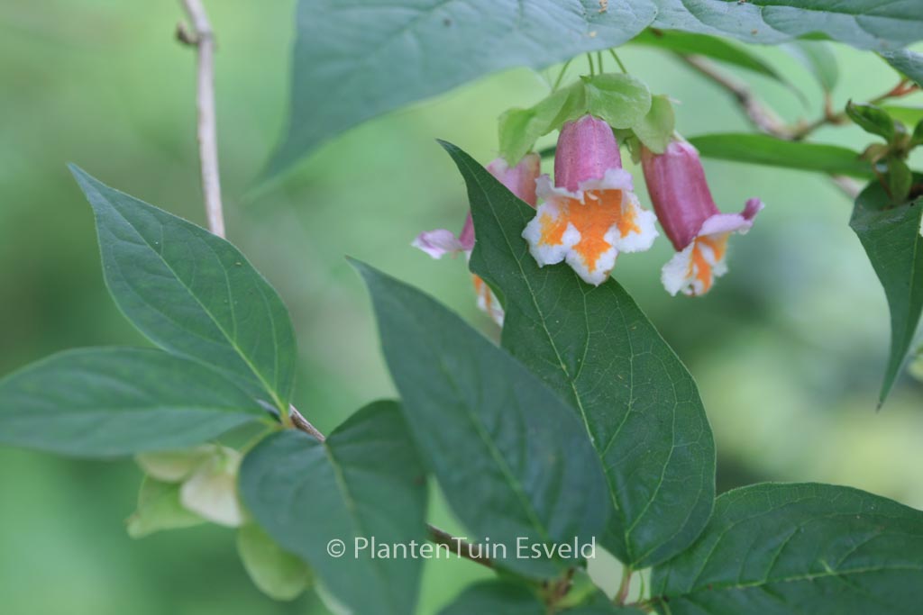 zomerbloeiende heester rijke bloei, mooie stam Echt een opvallende bloeiheester, maar ook de vruchten zijn decoratief. De hoogte na 10 jaar is 200 cm. De bloemkleur is rosezalm. De bloeiperiode is juni – juli. Deze plant is zeer winterhard. Aanbevolen aantal per vierkante meter : 1. Nederlandse naam : Chinese kamperfoelie . . Is aanwezig op de kwekerij. Kijk ook op de voorraadlijst op onze site.