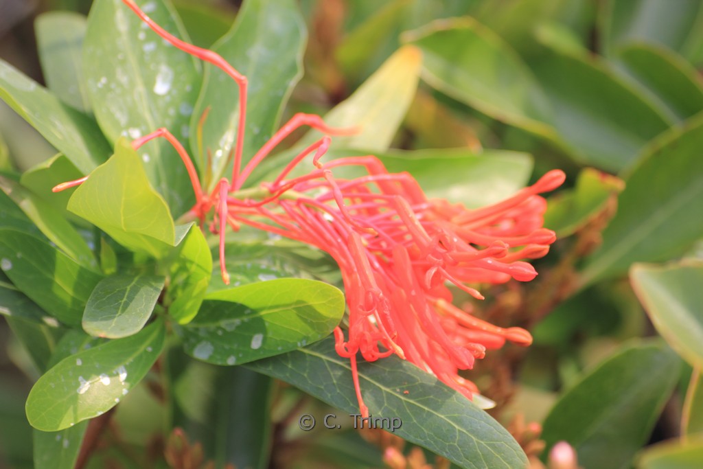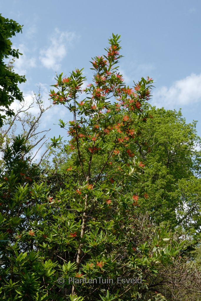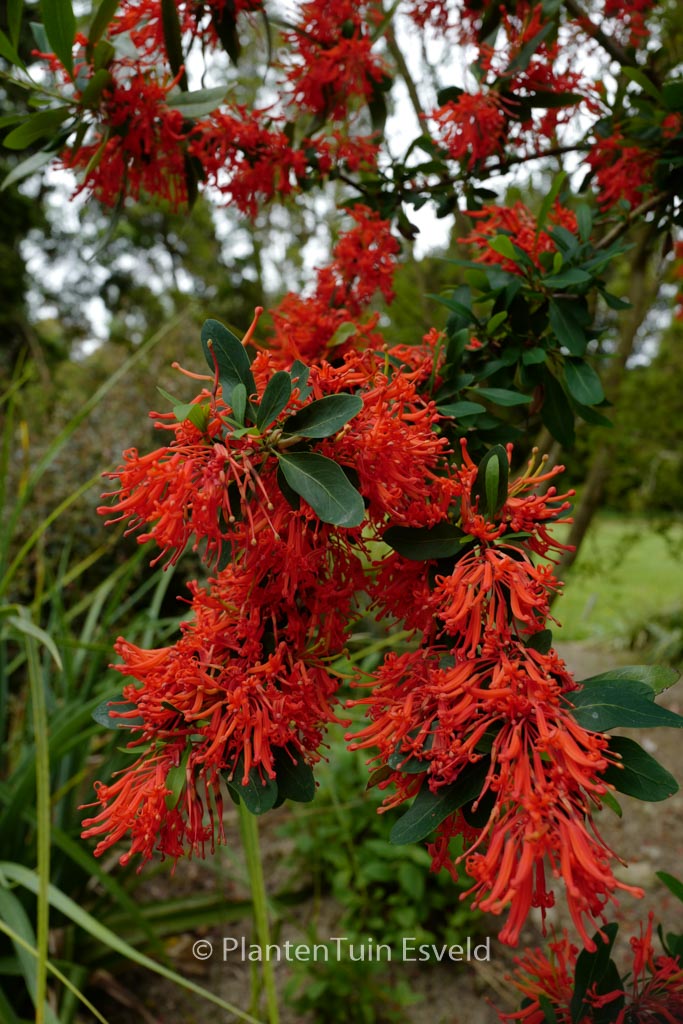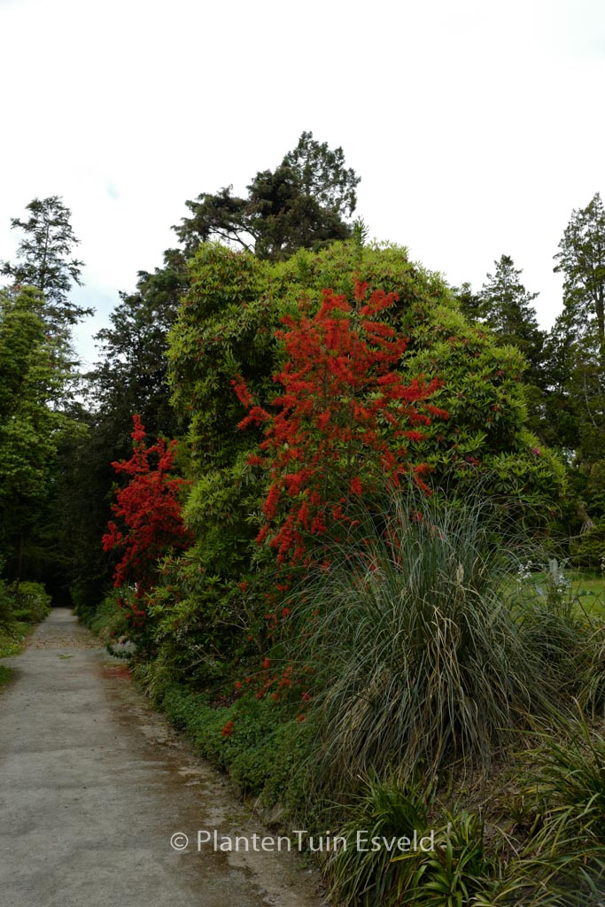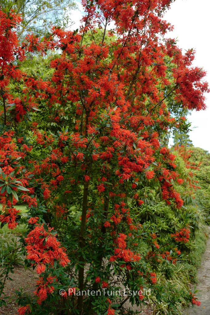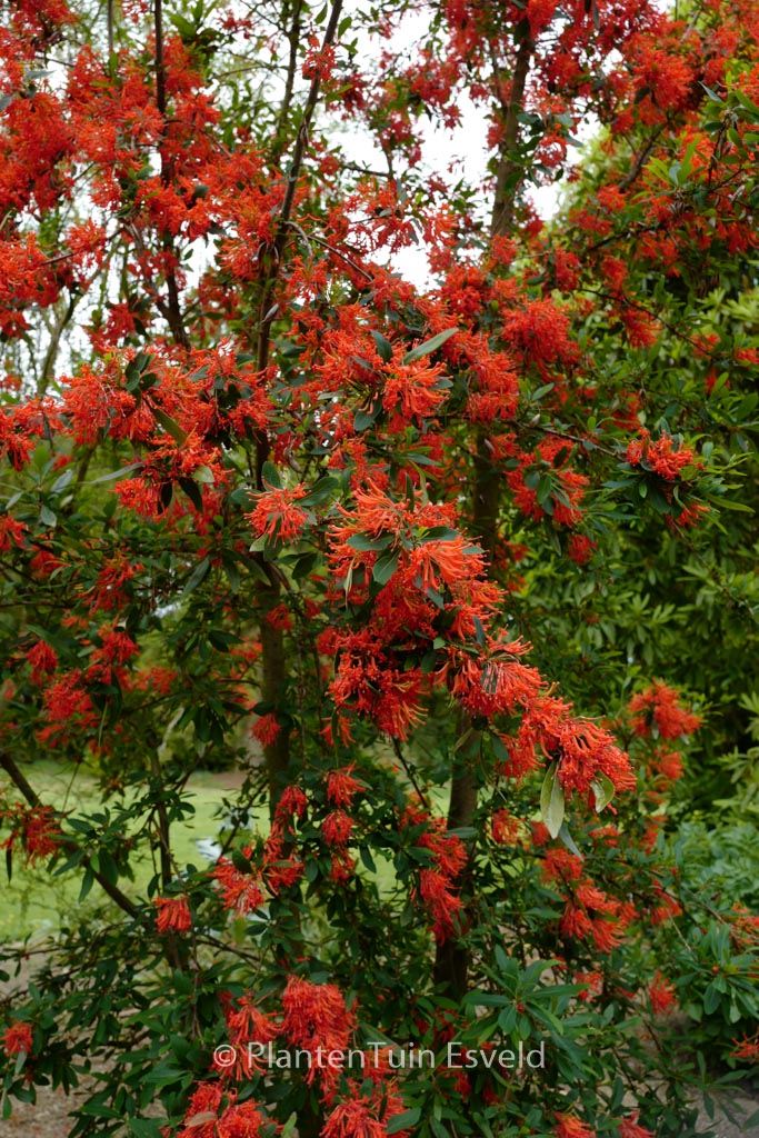 Chileense wintergroene struik met vuurrode bloemen De Chileense vuurstruik is een van de opvallendste wintergroene bomen uit de gematigde streken van Chili. De winterhardheid is bij ons op, of in strenge winters over, het randje. Dus let daar wel een beetje op en plant hem op een beschutte plek. De hoogte na 10 jaar is 4 meter. De bloemkleur is vuurrood. De bloeiperiode is juni – juli. Deze plant is matig winterhard. Aanbevolen aantal per vierkante meter : 1. Nederlandse naam : Chileense vuurstruik . . Alleen op bestelling leverbaar. Levertijd minstens 1 week.