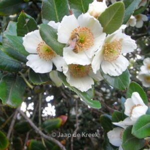 wintergroene struik met geurende bloemen die op een beschutte standplaats zelfs tot een boompje kan uitgroeien. In Engelse tuinen een graag geziene gast en langzaam maar zeker ook bezig aan een opmars in Nederland. De bloei, meestal in het begin van de herfst kan behoorlijk spectaculair zijn. De hoogte na 10 jaar is 4 meter. De bloemkleur is wit. De bloeiperiode is augustus. Deze plant is matig winterhard. Nederlandse naam : Eucryphia . . Is aanwezig op de kwekerij. Kijk ook op de voorraadlijst op onze site.