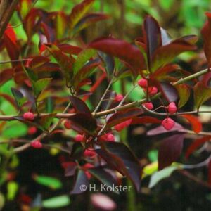 kardinaalsmuts met een buitengewoon mooie herfstkleur. De hoogte na 10 jaar is 3 m. De vruchtkleur is rose. De vruchtperiode is augustus – september. Deze plant is goed winterhard. Aanbevolen aantal per vierkante meter : 1. Nederlandse naam : Aziatische kardinaalsmuts . . Alleen op bestelling leverbaar. Levertijd minstens 1 week. .