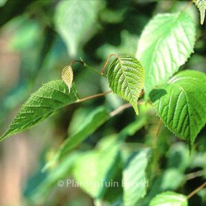 opgaande struik of kleine boom met mooie getande bladeren. De herfstkleur is van een subtiele schoonheid. De Japanse achtergrond van deze boom wordt wel eens vergeten. In Japans georienteerde tuinen is dit dus een uitstekend inpasbare boom. In de natuur staat hij vaak op vrij vochtige grond. Dat is bij ons in het veengebied een voordeel. De hoogte na 10 jaar is 5 m. De bloemkleur is groenig. De bloeiperiode is mei. Deze plant is goed winterhard. Aanbevolen aantal per vierkante meter : 1. . . Is aanwezig op de kwekerij. Kijk ook op de voorraadlijst op onze site.