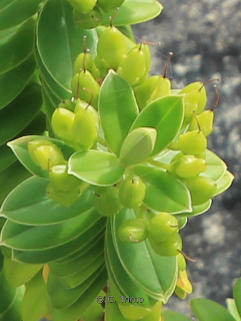 compacte wintergroene struik, zonnige beschutte plek. De hoogte na 10 jaar is 50 cm. De bloemkleur is bleekblauw. De bloeiperiode is mei – juli. Deze plant is matig winterhard. Nederlandse naam : Struikveronica . Deze plant heeft de volgende onderscheiding: AGM, Award of Garden Merit, 2002. . Alleen op bestelling leverbaar. Levertijd minstens 1 week.