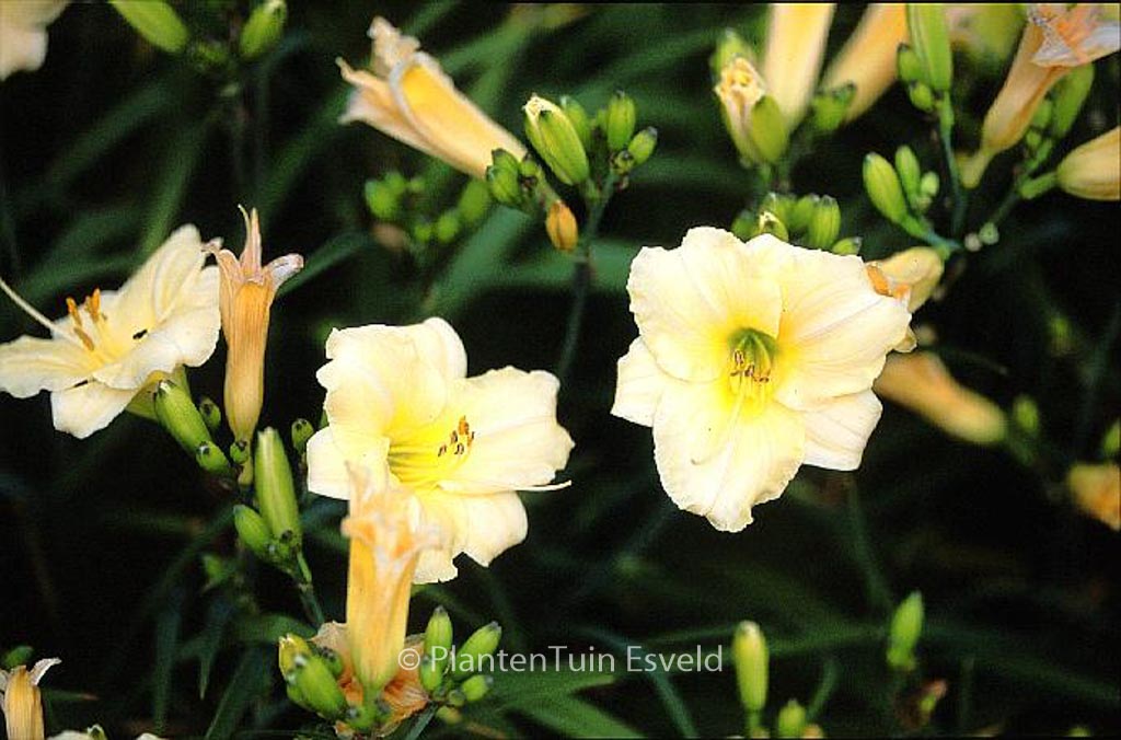 Lage, grootbloemige selectie met mooie pastelkleur. De gemiddelde hoogte is 50 cm. De bloemkleur is cremewit met gele keel. De bloeiperiode is juli – augustus. Deze plant is zeer winterhard. Aanbevolen aantal per vierkante meter : 5. Dit artikel is slechts in kleine hoeveelheden beschikbaar en kan plotseling niet meer leverbaar blijken. Nederlandse naam : Daglelie . . Alleen op bestelling leverbaar. Levertijd minstens 1 week.
