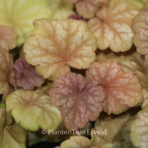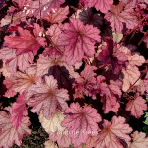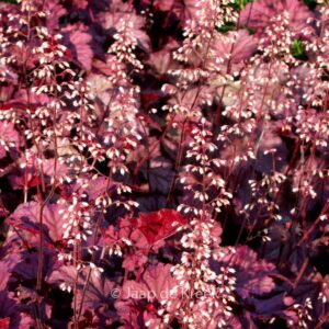 Blad verkleurt van rose naar lilarose en bruinrood. De gemiddelde hoogte is 40 cm. De bloemkleur is wit. De bloeiperiode is juni – juli. Deze plant is goed winterhard. Nederlandse naam : Purperklokje . . Alleen op bestelling leverbaar. Levertijd minstens 1 week.