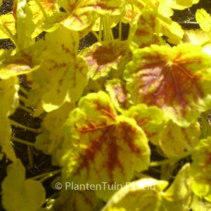 Roodbruin blad met een fijn, limoengroen randje. De gemiddelde hoogte is 30 cm. De bloemkleur is wit. De bloeiperiode is juni – juli. Deze plant is goed winterhard. Aanbevolen aantal per vierkante meter : 9. Nederlandse naam : Schuimklokje . . Alleen op bestelling leverbaar. Levertijd minstens 1 week.