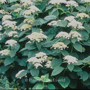 Schermbloemige hortensia met een rijke bloei. De bloemen zijn niet zo topzwaar als bij veel van de bolbloemige cultivars van Hydrangea arborescens. Bovendien is deze goed toepasbaar in een wat natuurlijker tuinsfeer. De hoogte na 10 jaar is 100 cm. De bloemkleur is wit. De bloeiperiode is juli – augustus. Deze plant is zeer winterhard. Aanbevolen aantal per vierkante meter : 2. Nederlandse naam : Boomhortensia . . Is aanwezig op de kwekerij. Kijk ook op de voorraadlijst op onze site.