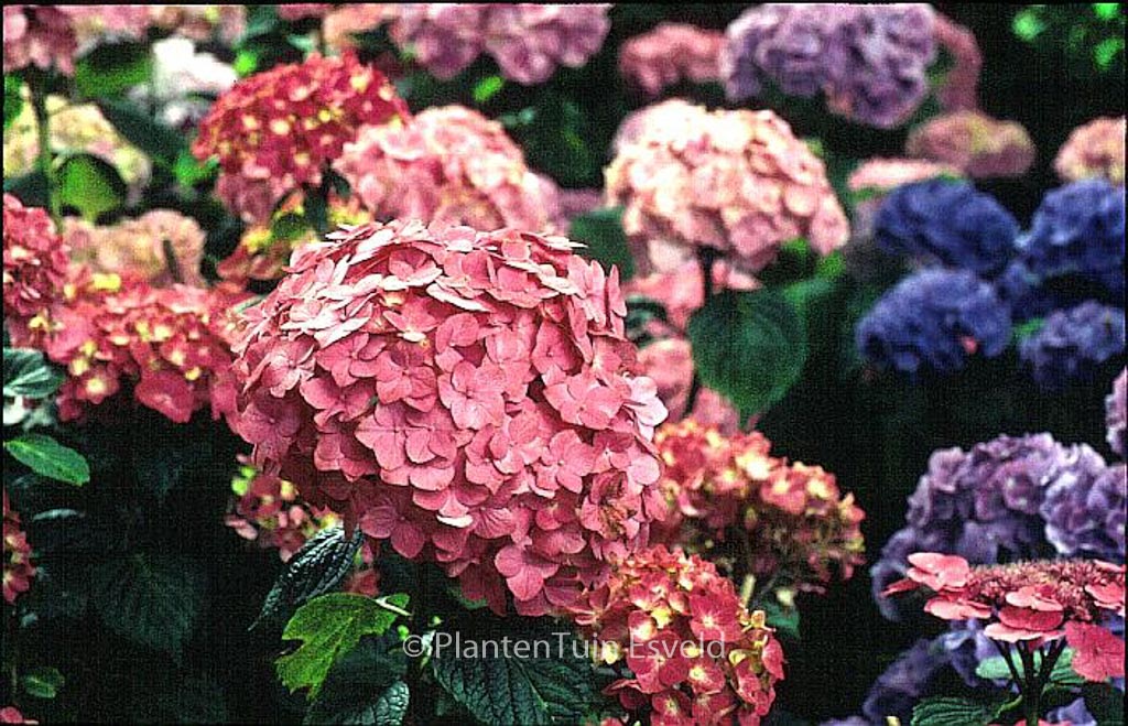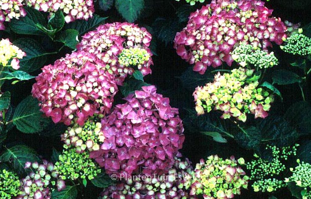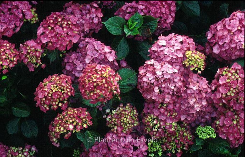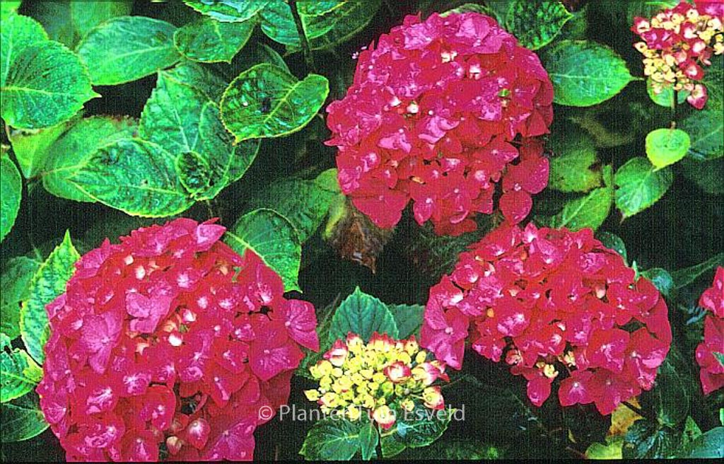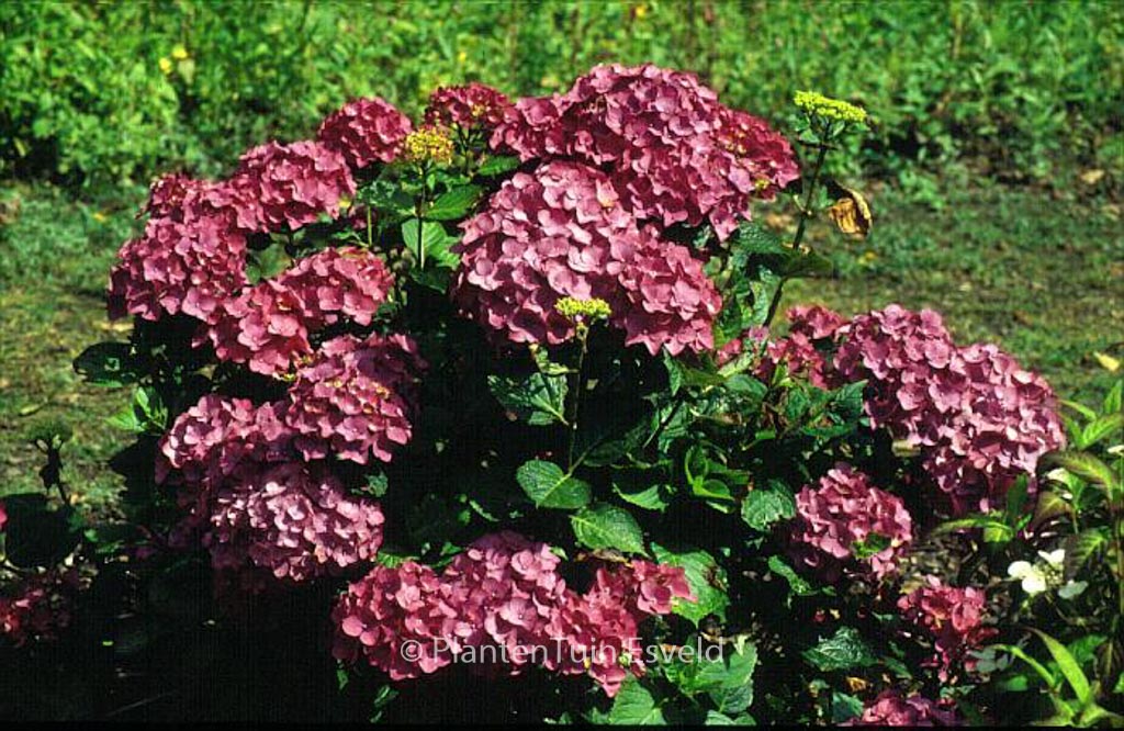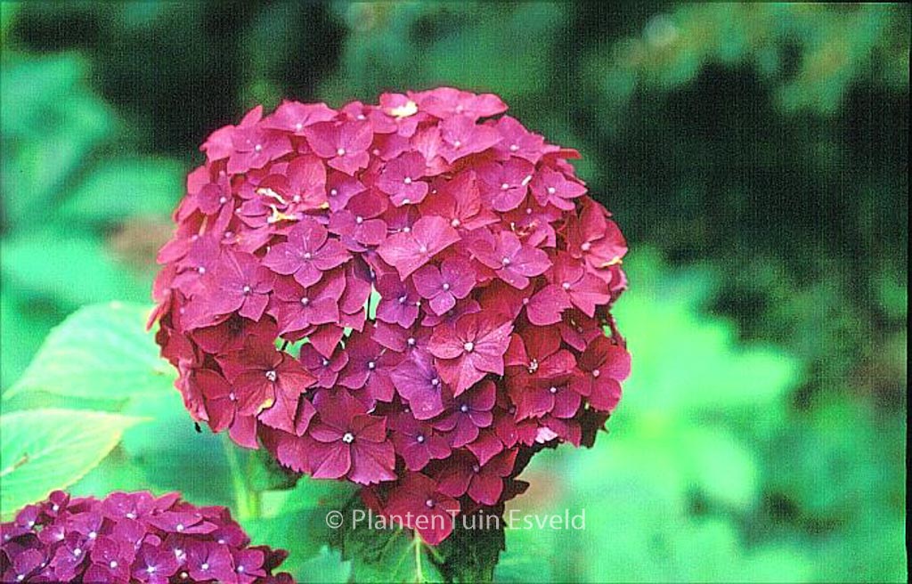 bolbloemige hortensia met vrij donkere takken. De hoogte na 10 jaar is 125 cm. De bloemkleur is roserood. De bloeiperiode is juli – september. Deze plant is zeer winterhard. Nederlandse naam : Boerenhortensia . . Alleen op bestelling leverbaar. Levertijd minstens 1 week.