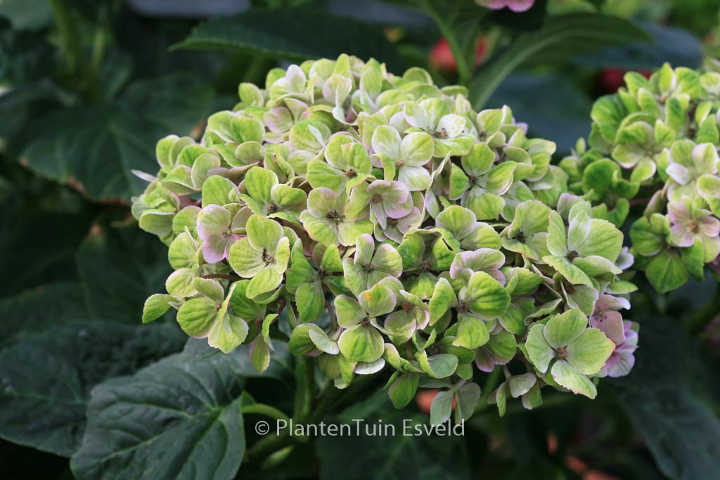 bolhortensia geschikt als snijbloem met groenrose bloemen. De hoogte na 10 jaar is 150 cm. De bloemkleur is groen met rose, herfst groen. De bloeiperiode is juli – september. Deze plant is zeer winterhard. Aanbevolen aantal per vierkante meter : 3. Nederlandse naam : Boerenhortensia . . Alleen op bestelling leverbaar. Levertijd minstens 1 week.