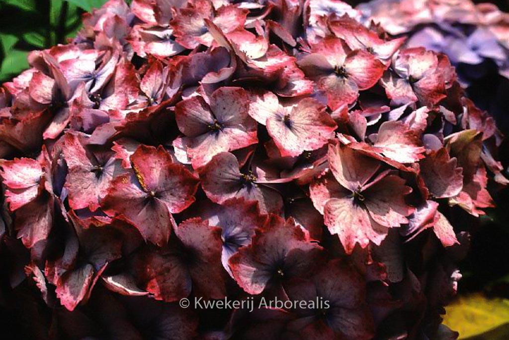 tamelijke laagblivende hortensia met bolbloemen. De hoogte na 10 jaar is 125 cm. De bloemkleur is rose/blauw. De bloeiperiode is juli – oktober. Deze plant is goed winterhard. Aanbevolen aantal per vierkante meter : 3. Nederlandse naam : Boerenhortensia . . Alleen op bestelling leverbaar. Levertijd minstens 1 week.