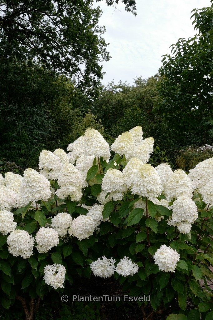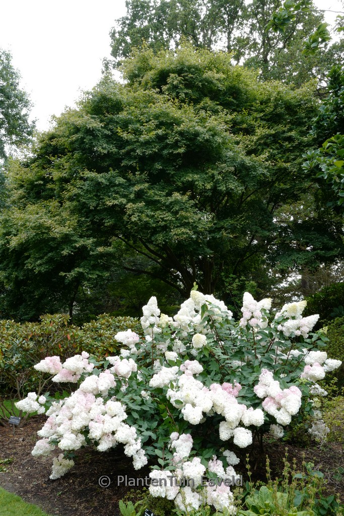pluimhortensia, met grote bolbloemen, mooi doorkleurend en misschien wel een van de spectaculairste hortensia’s als je de ruimte hebt. De bloemen zijn flinke gevulde pluimen, maar de takken zijn stevig genoeg om de grote bloemen te dragen. De hoogte na 10 jaar is 400 cm. De bloemkleur is wit later rose. De bloeiperiode is juli – september. Deze plant is zeer winterhard. Aanbevolen aantal per vierkante meter : 1. Nederlandse naam : Pluimhortensia Mogelijk alternatief : Hydrangea paniculata ‘Limelight’. Belangrijkste verschil: Hydrangea paniculata ‘Limelight’ iets kleinere bloemen. Deze plant heeft de volgende onderscheiding: AGM, Award of Garden Merit, 2008, tevens 3 sterren (uitstekend) veldkeuring van de Koninklijke Vereniging voor Boskoopse Culturen 2009. . Is aanwezig op de kwekerij. Kijk ook op de voorraadlijst op onze site.