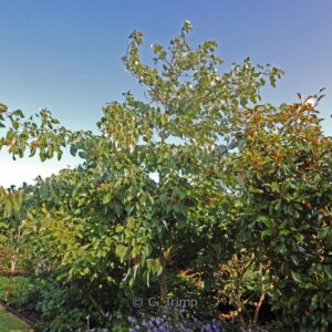etagevormende chinese boom met opvallende rode vruchten. De hoogte na 10 jaar is 5 meter. De vruchtkleur is rood. De bloeiperiode is mei. Deze plant is goed winterhard. Nederlandse naam : Oranjekers . . Alleen op bestelling leverbaar. Levertijd minstens 1 week.