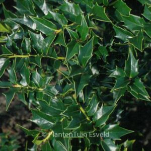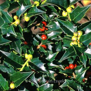 amerikaanse selectie mooi glimmend blad. De hoogte na 10 jaar is 250cm. De vruchtkleur is bes rood. De bloeiperiode is augustus – oktober. Deze plant is goed winterhard. Nederlandse naam : Hulst . . Alleen op bestelling leverbaar. Levertijd minstens 1 week.