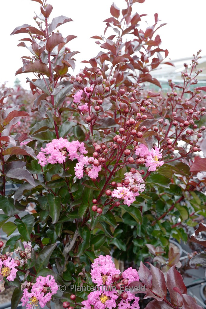 zomerbloeiend boompje met roodgroen blad, opvallende stam en fraaie nazomerbloei. In heel koele zomers komt de bloei weleens te laat op gang en redt de Lagerstroemia het niet op tijd te gaan bloeien en blijven de knoppen dichtzitten. Op zulke momenten is klimaatverandering minder erg. De hoogte na 10 jaar is 250 cm. De bloemkleur is helder roserood. De bloeiperiode is augustus – september. Deze plant is goed winterhard. Aanbevolen aantal per vierkante meter : 1. . . Is aanwezig op de kwekerij. Kijk ook op de voorraadlijst op onze site.