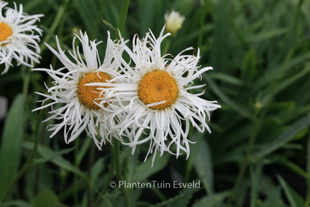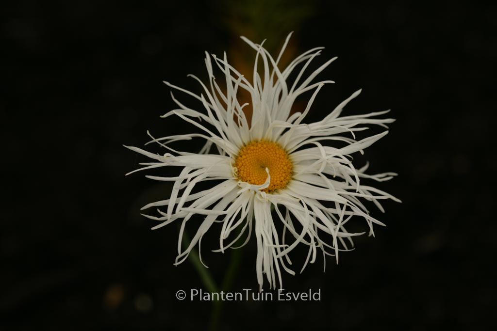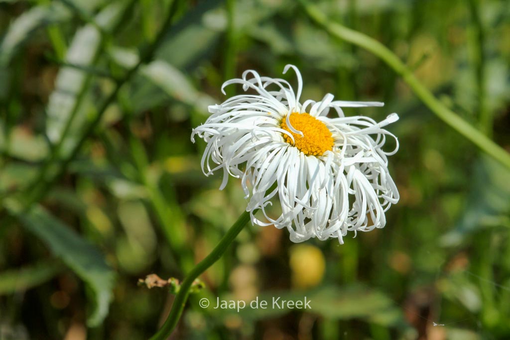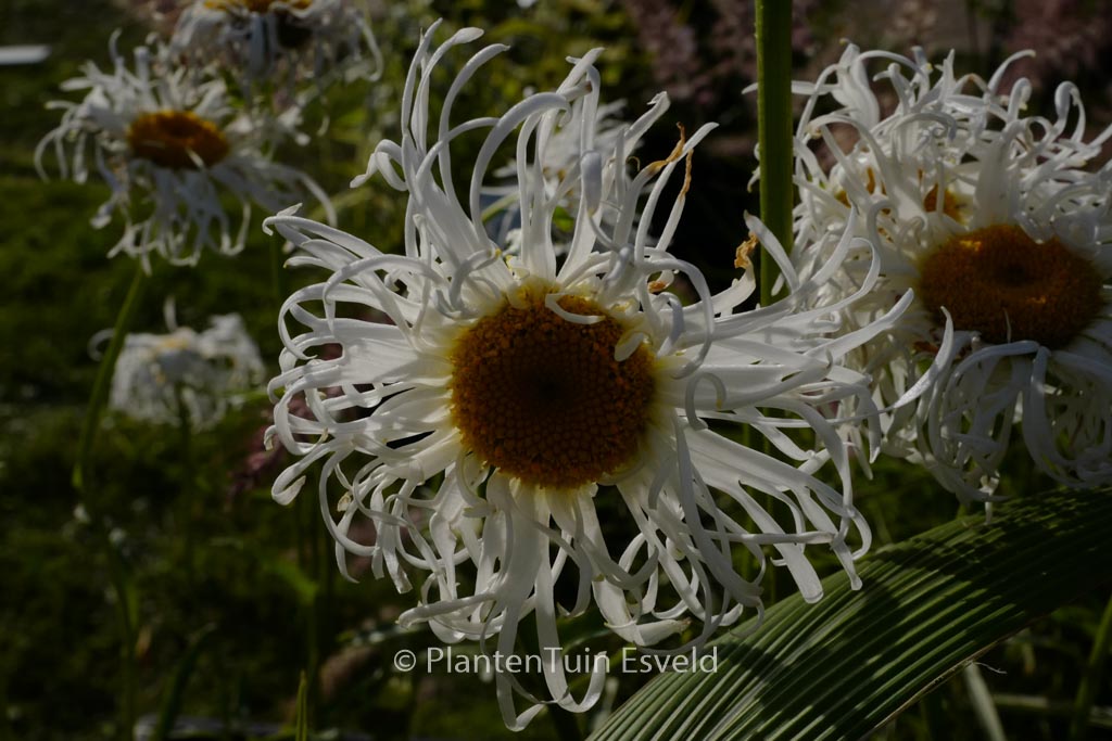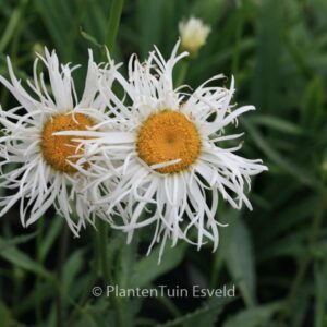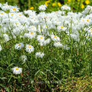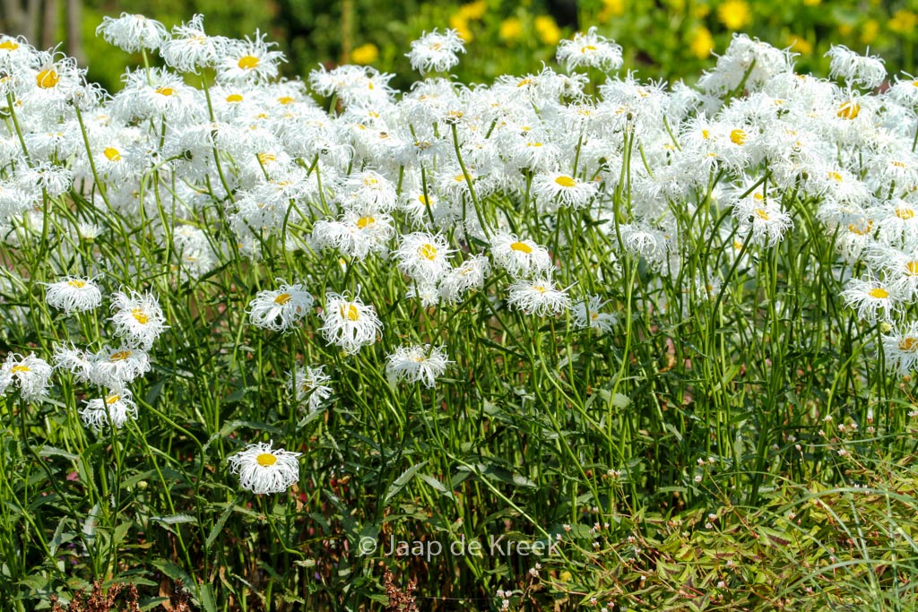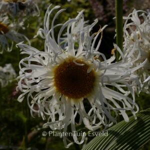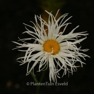 Lange, dunne, gedraaide bloemblaadjes; stevige stengels. De gemiddelde hoogte is 90 cm. De bloemkleur is wit met een geel hart. De bloeiperiode is juni – augustus. Deze plant is zeer winterhard. Aanbevolen aantal per vierkante meter : 9. Dit artikel is slechts in kleine hoeveelheden beschikbaar en kan plotseling niet meer leverbaar blijken. Nederlandse naam : Margriet . . Alleen op bestelling leverbaar. Levertijd minstens 1 week.