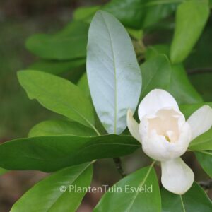 wintergroene boom zilveren onderzijde blad De kleine bloemen vallen misschien niet heel erg op, maar ze ruiken wel heerlijk. Dat is ook wat waard. In het Von Gimborn arboretum staan prachtige oude exemplaren. Dan wordt een mens direct weer verliefd op de Magnolia virginiana. De hoogte na 10 jaar is 4 m. De bloemkleur is geelgroen en geurend. De bloeiperiode is juni – juli. Deze plant is goed winterhard. Aanbevolen aantal per vierkante meter : 2. Nederlandse naam : Moerasmagnolia . . Alleen op bestelling leverbaar. Levertijd minstens 1 week. .
