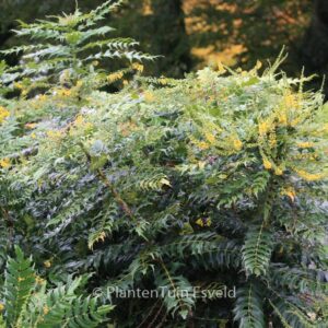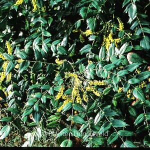 grootbladige wintergroene struik die bloeit in de winter In de schaduwtuin zijn Mahonia’s terecht graag geziene gasten. De bladstructuur in de winter, de heerlijke geur van de bloemen, het voegt echt iets toe. Zet deze Mahonia echter niet in de volle zon, daar houden ze niet van. De hoogte na 10 jaar is 250 cm. De bloemkleur is geel. De bloeiperiode is januari – maart. Deze plant is goed winterhard. Aanbevolen aantal per vierkante meter : 1. Nederlandse naam : Mahoniestruik Mogelijk alternatief : Mahonia media ‘Winter Sun’. Belangrijkste verschil: Mahonia media ‘Winter Sun’ iets kleiner blad. Deze plant heeft de volgende onderscheiding: AGM, Award of Garden Merit, 1993. . Is aanwezig op de kwekerij. Kijk ook op de voorraadlijst op onze site.