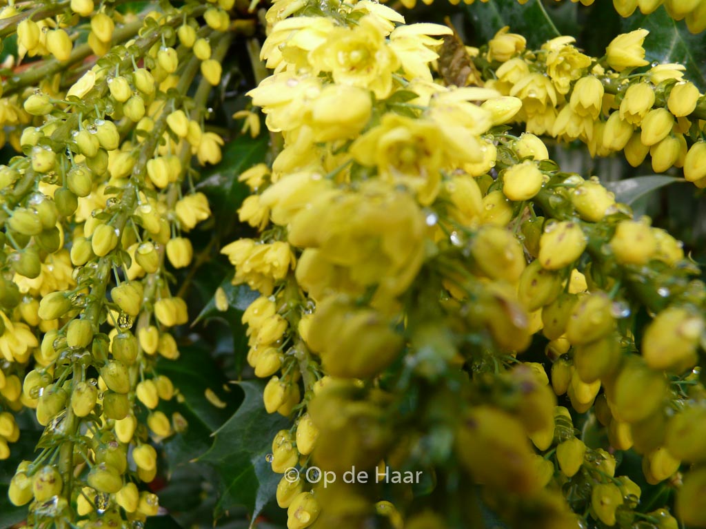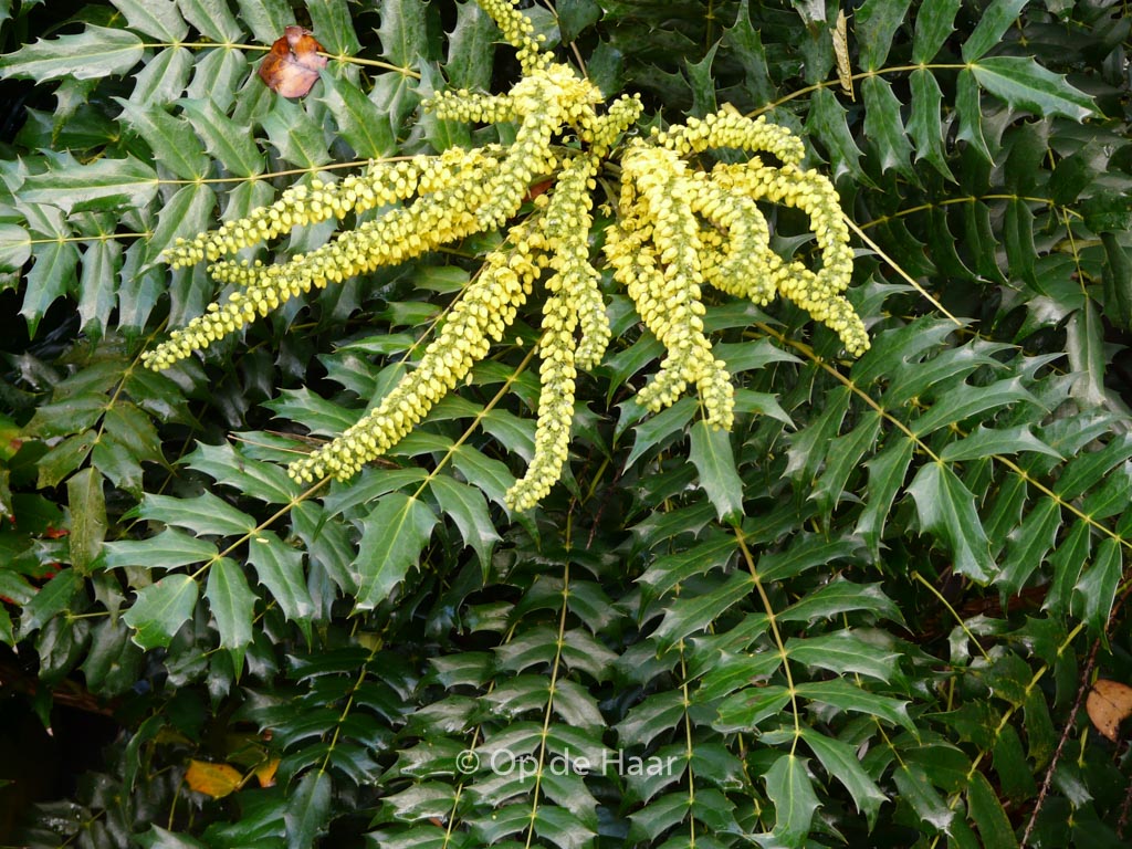 wintergroene winterbloeier met glimmende bladeren en een architectonisch voorkomen. Schaduwplanten pur sang zijn het, de Mahonia’s. Volle zon vinden ze minder tof. De hoogte na 10 jaar is 150 cm. De bloemkleur is geel. De bloeiperiode is februari – maart. Deze plant is goed winterhard. Aanbevolen aantal per vierkante meter : 1. Nederlandse naam : Mahoniestruik . . Is aanwezig op de kwekerij. Kijk ook op de voorraadlijst op onze site.