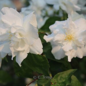 Boerenjasmijn met half gevulde, vrij grote bloemen De bloemen zijn opvallend groot voor een boerenjasmijn en dit draagt vanzelfsprekend bij aan de feestvreugde. De hoogte na 10 jaar is 250 cm. De bloemkleur is wit. De bloeiperiode is mei – juni. Deze plant is goed winterhard. Nederlandse naam : Boerenjasmijn . . Alleen op bestelling leverbaar. Levertijd minstens 1 week. .