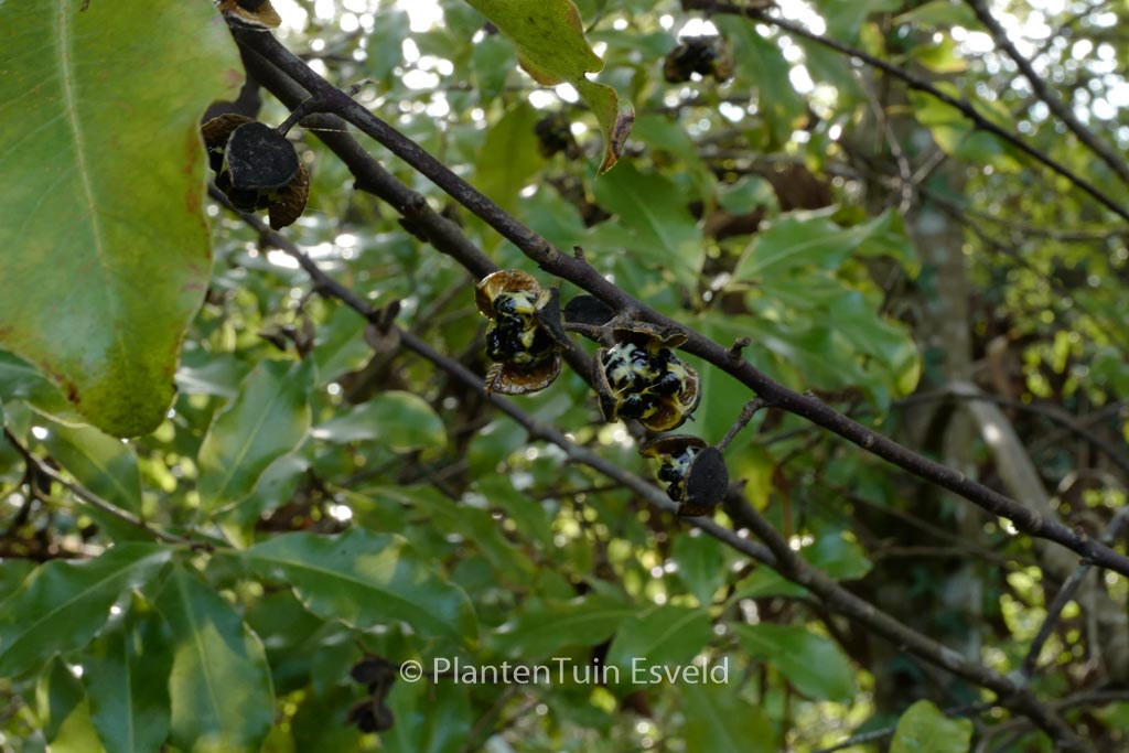 wintergroene struik uit Nieuw Zeeland. De hoogte na 10 jaar is 300 cm. De bloemkleur is paarsbruin. De bloeiperiode is augustus. Deze plant is niet winterhard. Aanbevolen aantal per vierkante meter : 2. Nederlandse naam : Australische laurier . . Alleen op bestelling leverbaar. Levertijd minstens 1 week.