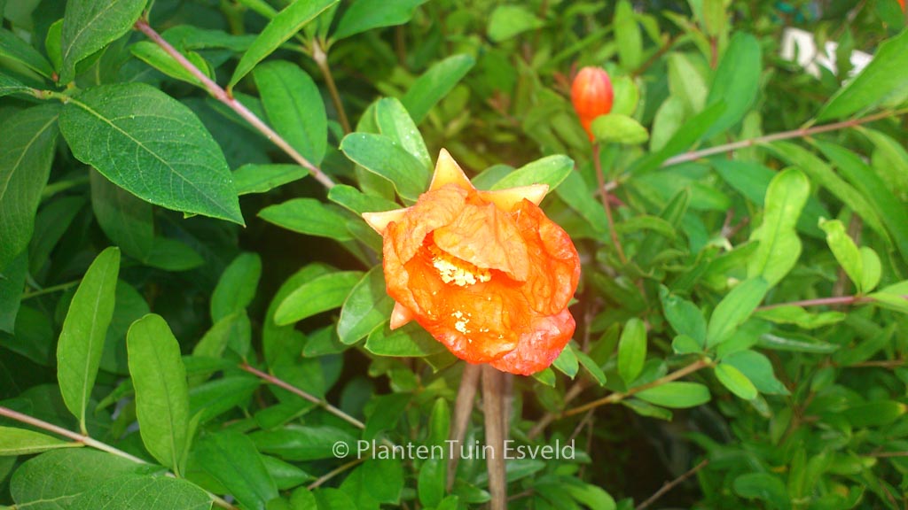 Dwergvorm; in alle delen kleiner; mediterrane kuipplant. De hoogte na 10 jaar is 1,25 m. De bloemkleur is rood-oranje. De bloeiperiode is mei – juni. Deze plant is matig winterhard. Aanbevolen aantal per vierkante meter : 3. Nederlandse naam : Granaatappel . Deze plant heeft de volgende onderscheiding: AGM, Award of Garden Merit, 2002. . Is aanwezig op de kwekerij. Kijk ook op de voorraadlijst op onze site.