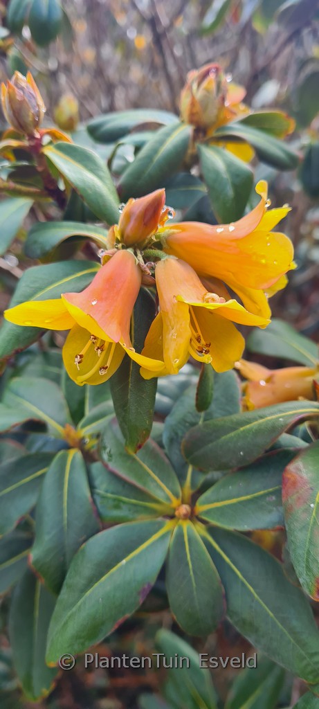 species met zeer bijzondere bloemen De Rhododendron species zijn vaak moeilijk in de cultuur. De uitval kan soms groot zijn, wij kunnen hergroei helaas hiervan niet garanderen. De hoogte na 10 jaar is 150 cm. De bloemkleur is geeloranje. De bloeiperiode is mei. Deze plant is goed winterhard. Aanbevolen aantal per vierkante meter : 3. Nederlandse naam : Rhododendron . . Is aanwezig op de kwekerij. Kijk ook op de voorraadlijst op onze site.