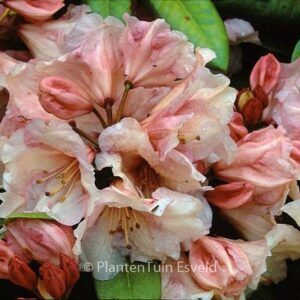 Wardii-hybride verlangt humeuze grond en halfschaduw Niet alleen een mooie en ongewone bloemkleur maar ook nog eens fris groen blad. Wat wil een mens nog meer. De hoogte na 10 jaar is 250 cm. De bloemkleur is abrikoos maar rose uit knop. De bloeiperiode is mei. Deze plant is goed winterhard. Aanbevolen aantal per vierkante meter : 2. Nederlandse naam : Rhododendron . . Alleen op bestelling leverbaar. Levertijd minstens 1 week.