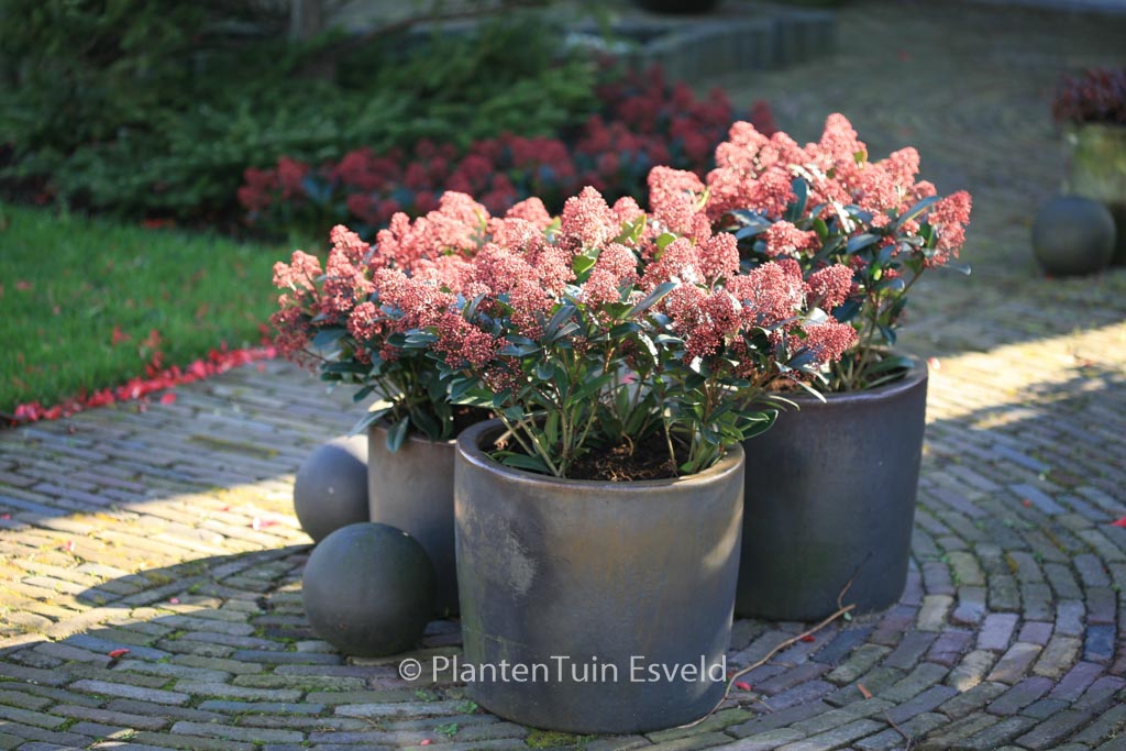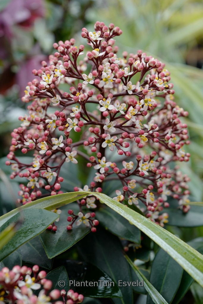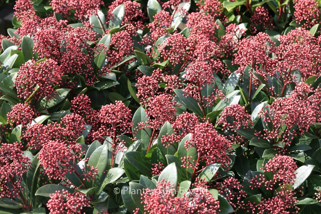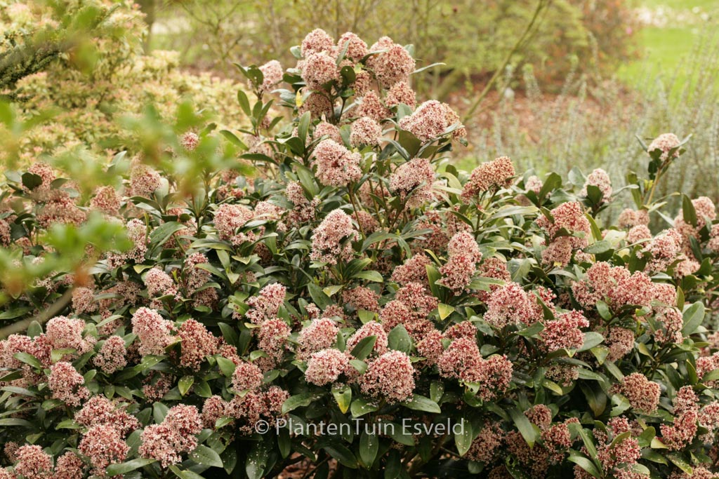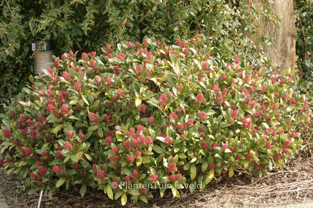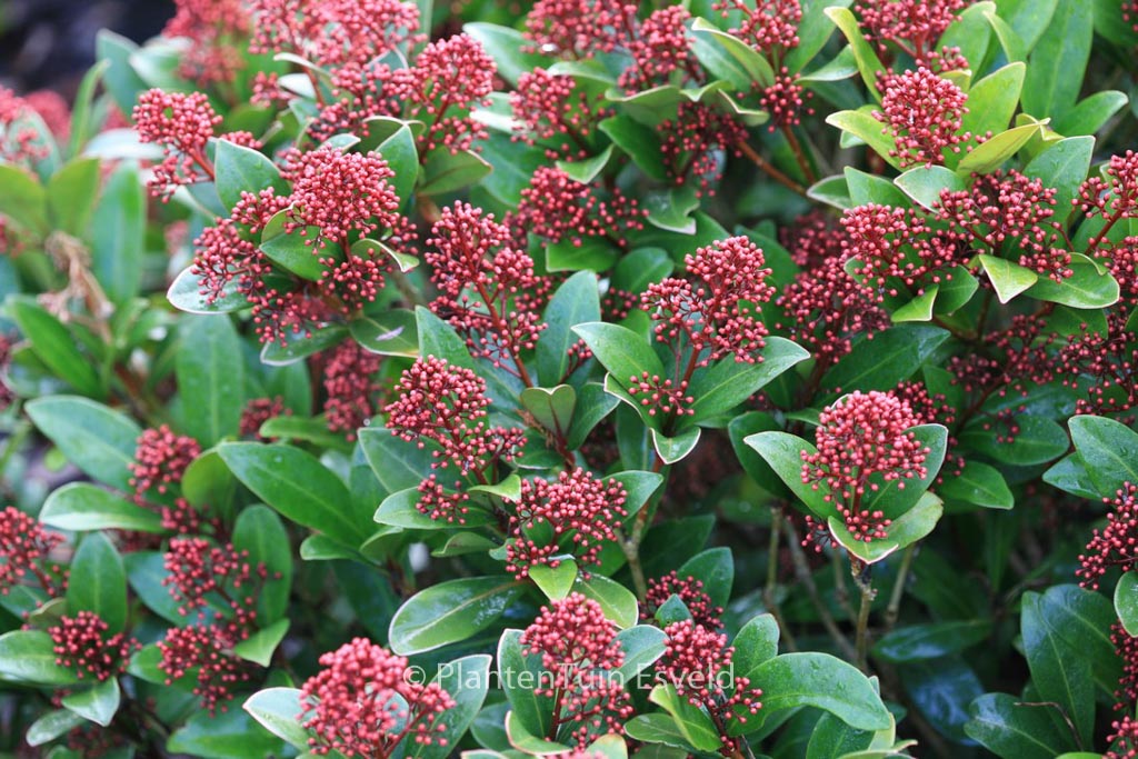 mannelijke skimmia voor half schaduw tot schaduw want in de zon verkleurt het blad vaak lelijk geelgroen. Rubella is een uitstekende bestuiver voor de vruchtzettende cultivars zoals de grootvruchtige Pabella. Het is veruit de bekendste van alle Skimmia cultivars, vanwege de mooie rode bloemknoppen. De hoogte na 10 jaar is 100 cm. De bloemkleur is rood in knop, later wit. De bloeiperiode is oktober – maart. Deze plant is goed winterhard. Aanbevolen aantal per vierkante meter : 3. Nederlandse naam : Skimmia . Deze plant heeft de volgende onderscheiding: AGM, Award of Garden Merit, 1993. . Alleen op bestelling leverbaar. Levertijd minstens 1 week.