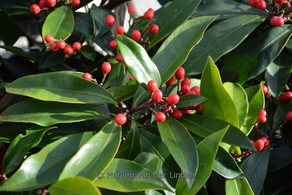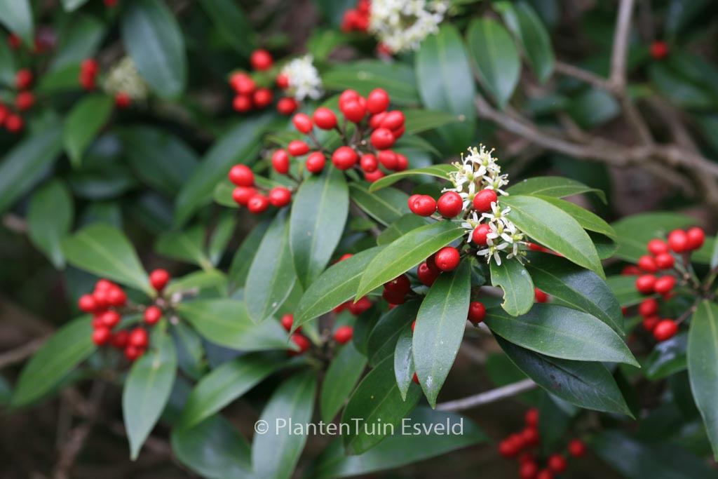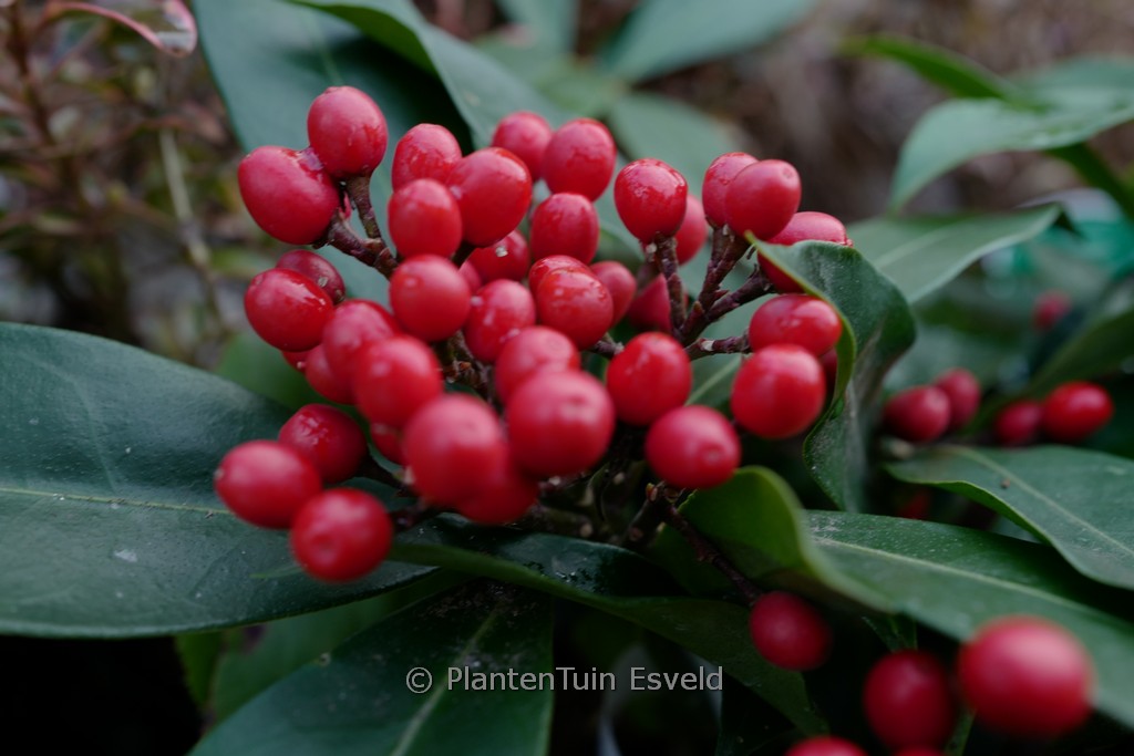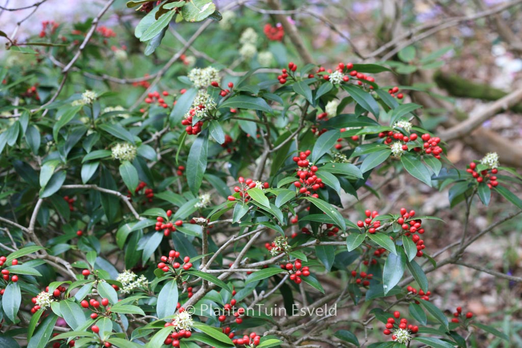 wintergroen struikje tweeslachtig, geen mannelijke nodig Skimmia reevesiana is een echte schaduwminnende heester. Het smalle wintergroene blad en de helderrode bessen maken het in de winter een bruikbare struik. De bloemen zijn relatief klein, maar ze geuren aangenaam. De hoogte na 10 jaar is 50 cm. De beskleur is rood. De besperiode is oktober – februari. Deze plant is goed winterhard. Aanbevolen aantal per vierkante meter : 4. Nederlandse naam : Skimmia . . Alleen op bestelling leverbaar. Levertijd minstens 1 week.