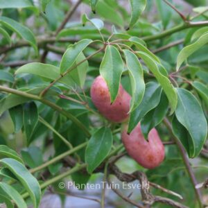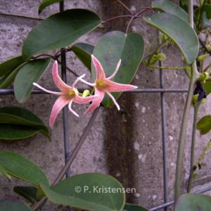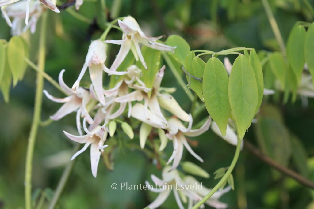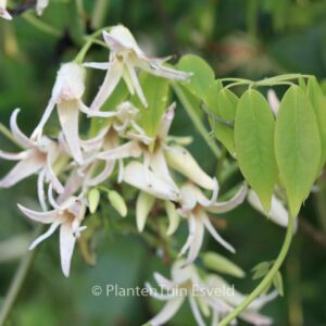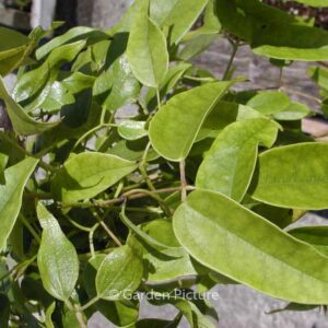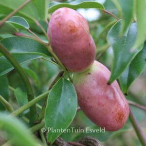 wintergroene klimmer met paarse ‘aardappelvruchten’ De bladeren doen wel wat denken aan die van de Akebia, een verwante klimplant, al zijn die van Stauntonia duidelijk groter. De cremewitte bloemen zijn decoratief en geuren licht. Stauntonia is tweehuizig, voor vruchten heb je dus mannelijke en vrouwelijke planten nodig. De hoogte na 10 jaar is 2. 5 meter. De bloemkleur is creme. De bloeiperiode is april – mei. Deze plant is matig winterhard. Aanbevolen aantal per vierkante meter : 1. Nederlandse naam : Chocoladrank . . Alleen op bestelling leverbaar. Levertijd minstens 1 week.