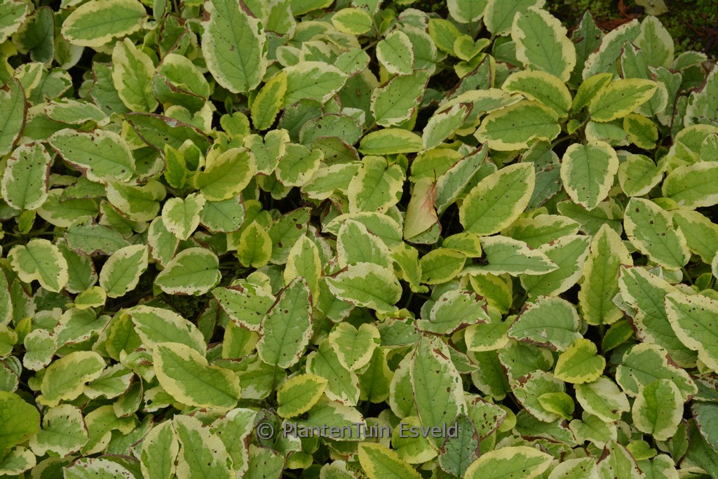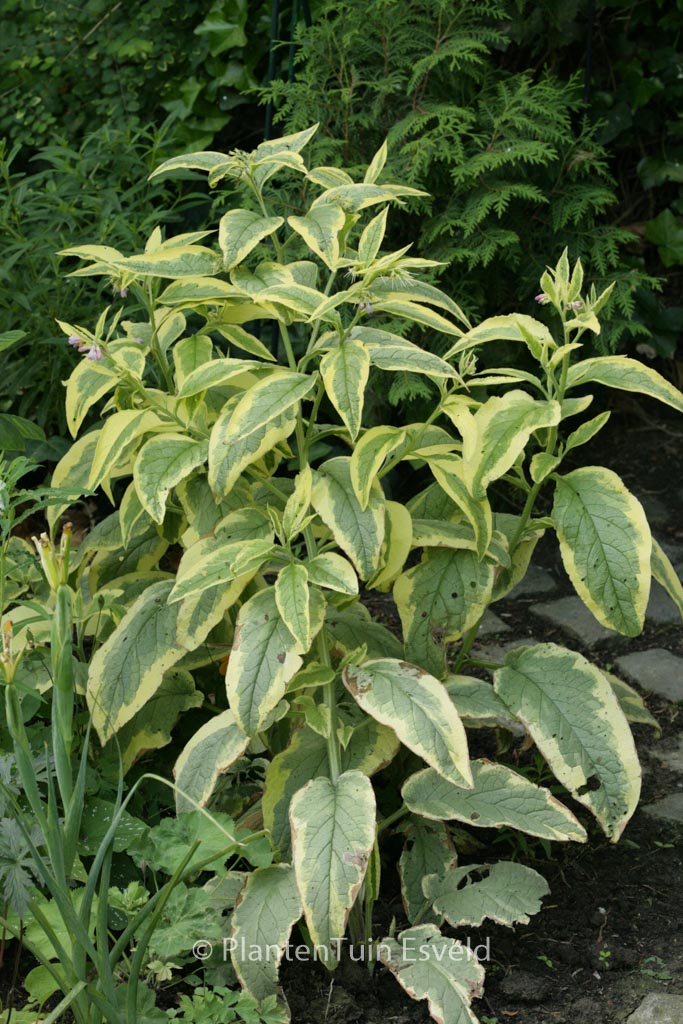 Smeerwortel met een creme- gele bladrand; lichte woekerneiging. De hoogte na 10 jaar is 30 cm. De bloemkleur is licht lilablauw. De bloeiperiode is april – mei. Deze plant is zeer winterhard. Aanbevolen aantal per vierkante meter : 5. Nederlandse naam : Kruipende smeerwortel . . Alleen op bestelling leverbaar. Levertijd minstens 1 week.