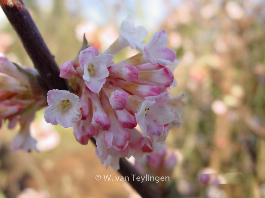 grote trosbloemen, geurend groot gegroefd blad, winterbloei De bloeitijd kan van jaar tot jaar wat varieren. Soms beginnen ze echtal volop te bloeien voor de jaarwisseling, soms wachten ze tot in januari. Als het vriest ligt de bloei meestal even stil, maar die wordt weer hervat zodra het dooit. De hoogte na 10 jaar is 1. 5 meter. De bloemkleur is wit. De bloeiperiode is december – maart. Deze plant is zeer winterhard. Nederlandse naam : Sneeuwbal . . Alleen op bestelling leverbaar. Levertijd minstens 1 week.