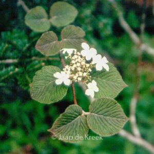 Synonym: V. alnifolium; rode bessen, wijnrode herfstkleur; vrij groot, gegroefd, elzenachtig blad. De hoogte na 10 jaar is 2 m. De bloemkleur is wit. De bloeiperiode is april – mei. Deze plant is goed winterhard. Aanbevolen aantal per vierkante meter : 1. Nederlandse naam : Sneeuwbal . . Is aanwezig op de kwekerij. Kijk ook op de voorraadlijst op onze site. .