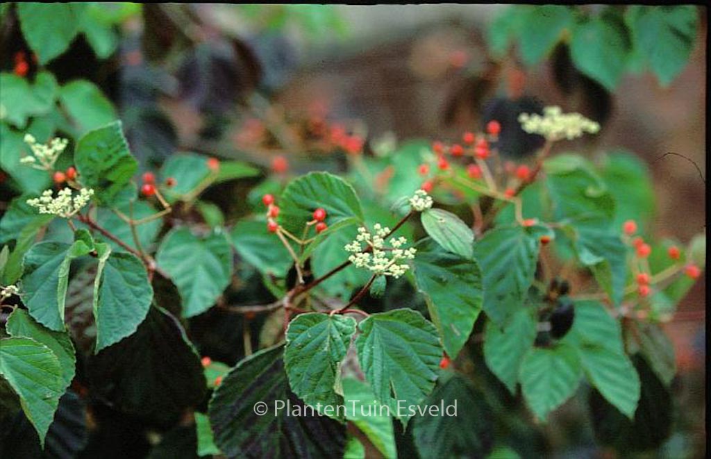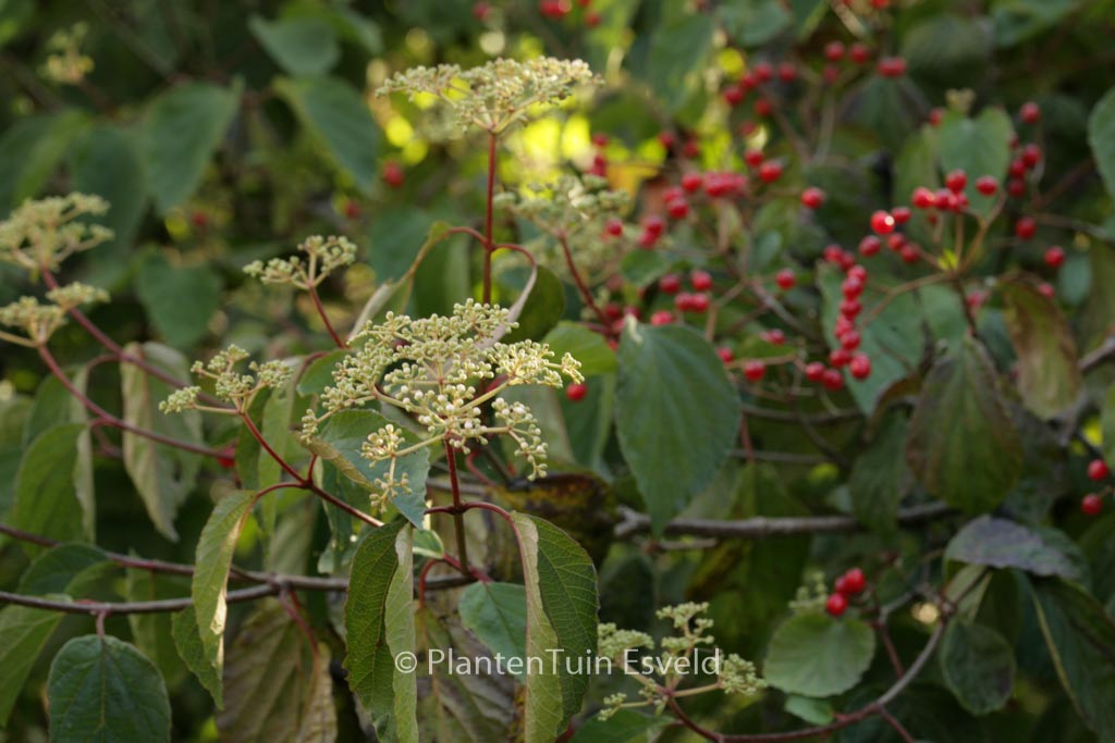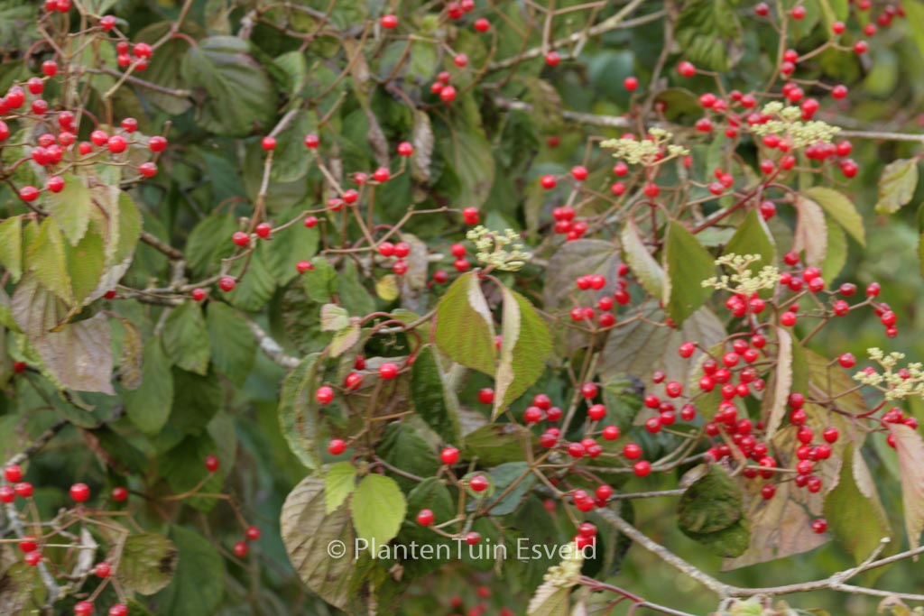 wijnrode herfstkleur wiite schermbloemen, rode bessen. De hoogte na 10 jaar is 100 cm. De bloemkleur is wit. De bloeiperiode is mei – juni. Deze plant is goed winterhard. Nederlandse naam : Sneeuwbal . . Is aanwezig op de kwekerij. Kijk ook op de voorraadlijst op onze site.